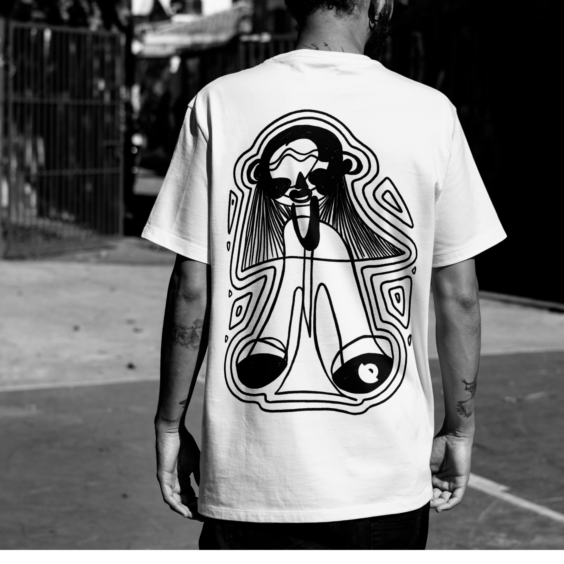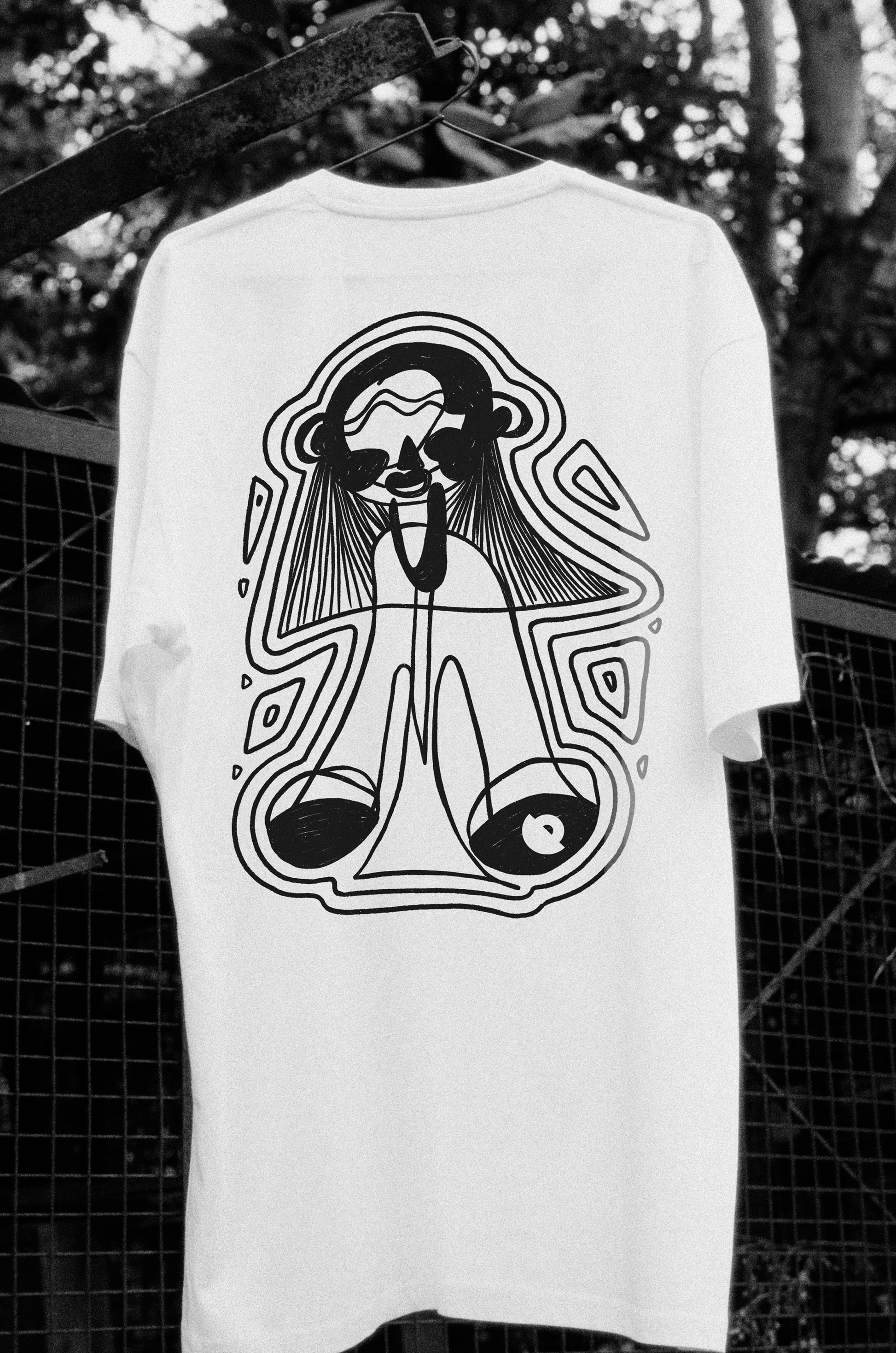Oversized printed T-shirt in white color with a round neck and short sleeves.